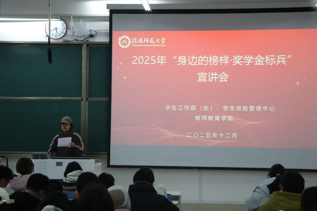 为树立可及标杆,激发学子动力,12月24日,教师教育学院在社科楼414教室举办2025年“身边的榜样·奖学金标兵”宣讲会。外国语学院郭郝冉、法学与社会学学院李萌以及国际教育学院于子涵三位奖学金标兵受邀作分享,该院全体学子到场聆听。