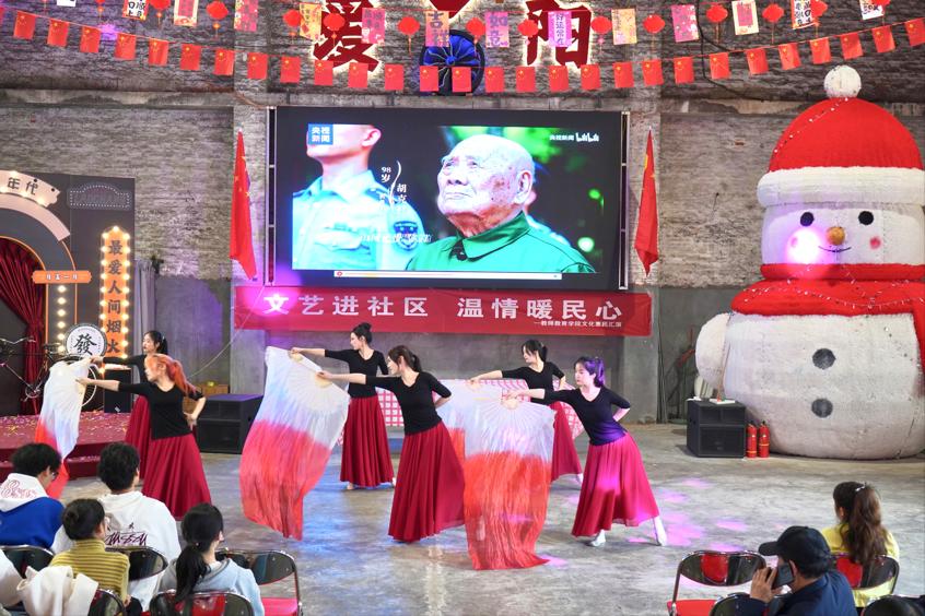 该院师生代表与社区居民欢聚一堂,以多元艺术为载体。演出现场气氛热烈,节目精彩纷呈。开场街舞以青春活力的舞步点燃氛围,独唱《立春》则以清新婉转的旋律带来一抹温柔,群体扇子舞《铭记》将红色记忆融入柔美舞姿,悠扬的钢琴独奏如涓涓细流浸润心田,《山河无恙》群体说唱唱出了青年一代对家国安宁的坚定信念,《故乡》双人吉他弹唱勾起人们对故土的深深眷恋,吴莉以一首独唱《我爱你中国》将现场气氛推向顶点,阿卡贝拉《稻香》则以纯净的和声描绘出充满希望的田园画卷,赢得社区居民的阵阵掌声与喝彩。