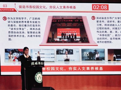 在项目展示环节,候选学院(书院)依次围绕项目实施背景、服务成效及创新亮点进行陈述。参赛项目聚焦学子日常需求,展示务实举措。物理电子工程学院在项目中构建了贯穿学子们成长全周期的服务体系:从新生入学教育到专业领域讲座,从志愿服务活动到就业考研指导,形成了“精准帮扶”的完整闭环。文学院通过搭建线上平台,规范管理考研自习室,为备考学子营造良好的学习环境。在“校园美化先锋”项目中,学子们组织志愿者定期清扫卫生角,维护公共空间整洁。在“一体两翼一先锋”南湖实践育人体系中,我校坚持以红色育人加强学子们的思想建设。参赛项目覆盖校园环境维护、干部培训、学业帮扶、权益维护等多个务实领域,体现了服务工作的广度与深度。