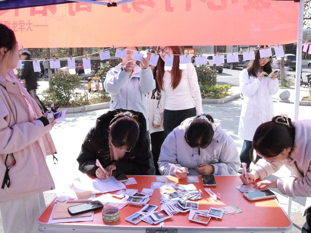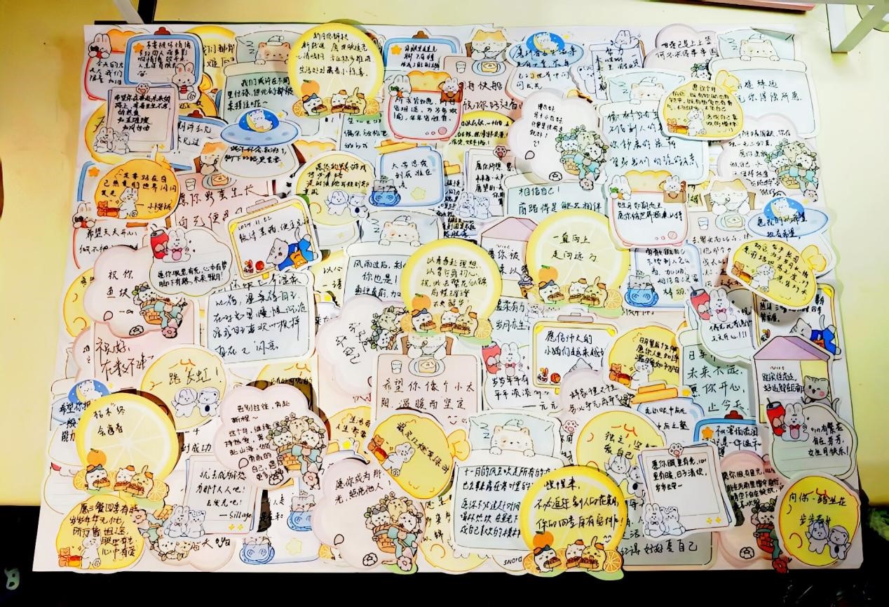 此次活动以便签为载体,为学子们搭建起互动交流平台,吸引全校学子积极参与。活动期间,参与者前往心语广场领取便签和照片,现场书写对身边人的关怀寄语。书写内容聚焦校园生活实际,既有对学业进步的真诚鼓励,如针对专业学习、考研上岸的加油打气,也有对日常生活细节的暖心关注,如提醒添衣保暖、保持身心健康的细致叮咛,亦包含对自我的期许,让文字成为自我对话与成长的见证。参与者还可以针对触动自己的留言进行回应,在一来一往的文字互动中建立情感连接。一张张便签承载着学子们对彼此的理解与鼓励,通过文字连接起真诚的关怀与善意。
